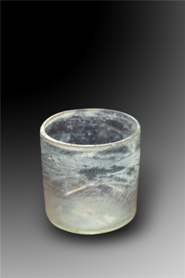 高7厘米,口径6.8厘米,无色透明玻璃质地,微受沁,底有一道裂纹,国家三级文物。定州博物馆借展。