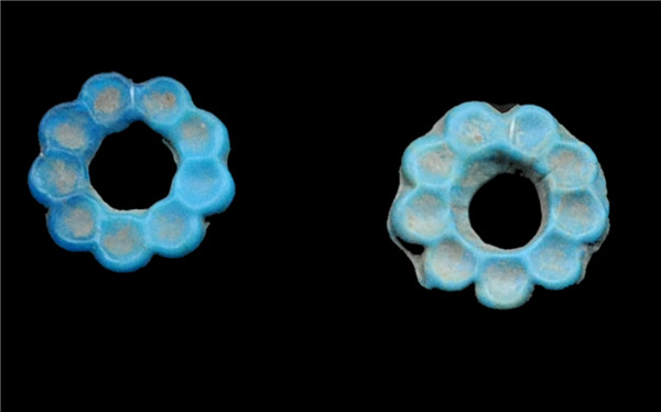 外径2.8厘米,内径1.2厘米,厚度0.35厘米,蓝色不透明玻璃质地,形制相同。九圆相连取“天长地久”之意。用途:服饰、组佩件等。