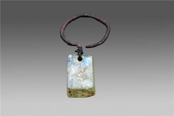 通高4.85厘米、玻璃饰高1.6厘米、宽1.1厘米、玻璃饰厚0.68厘米,无色透明玻璃质地,经冷加工制成,上部有一穿孔,有白色风化物,铜环锈蚀严重,无韧性。