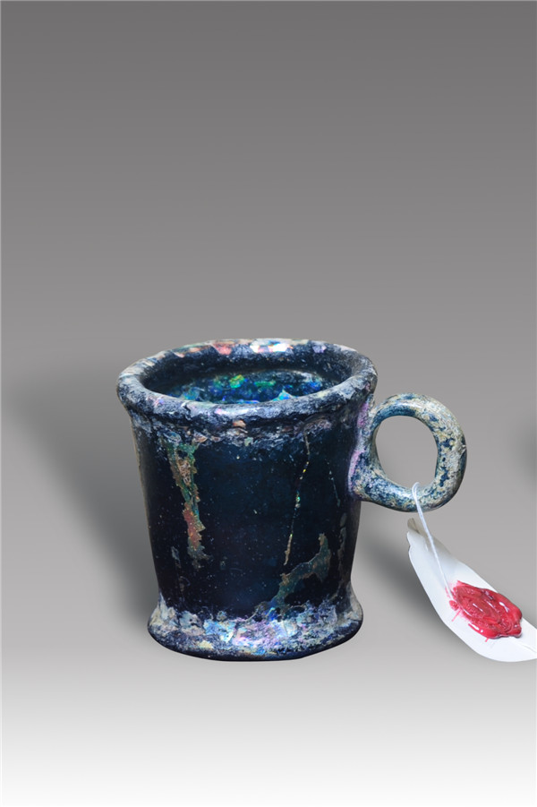 腹径6厘米,高7厘米,蓝色半透明玻璃材质,表面部分虹彩,杯口较厚,圆形侧耳,圈足外斜,出土于西亚,冯彦涛借展。