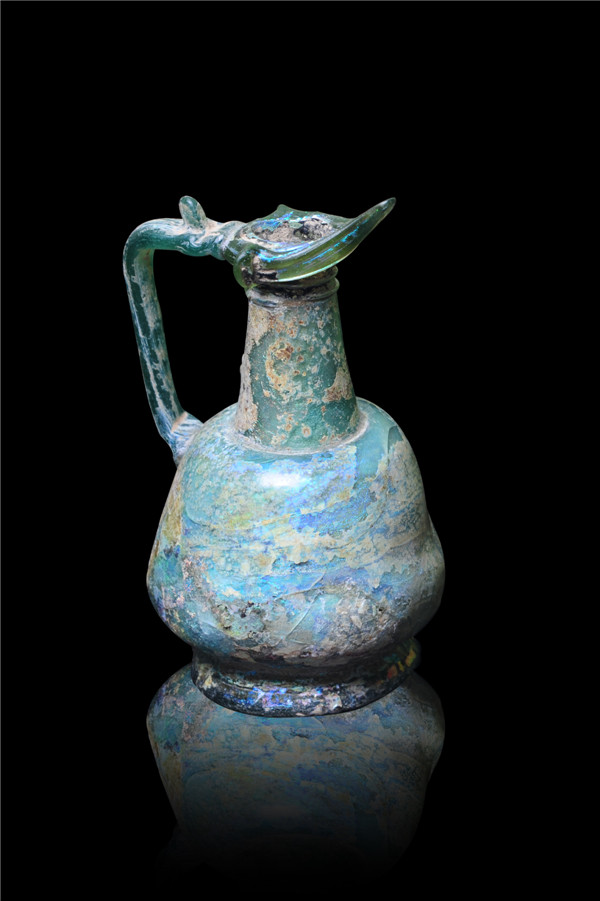 口径9厘米,高17厘米,绿色半透明玻璃质,表面部分风化,吹制成型,有虹彩,斜口,直颈,圆腹上收,圈足,单耳口腹相连,古西亚出土,同类器形最早出现于古罗马庞贝古城,后伊斯兰地区、中国辽宁等地也有出土,冯彦涛借展。