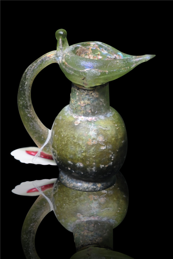 腹径4厘米,高8厘米,绿色半透明玻璃质,表面部分风化,吹制成型,有虹彩,斜口,直径,圆腹上收,圈足,单耳口腹相连,古西亚出土,同类器形最早出现于古罗马庞贝古城,后伊斯兰地区、中国北部辽宁等地也有出土,冯彦涛借展。