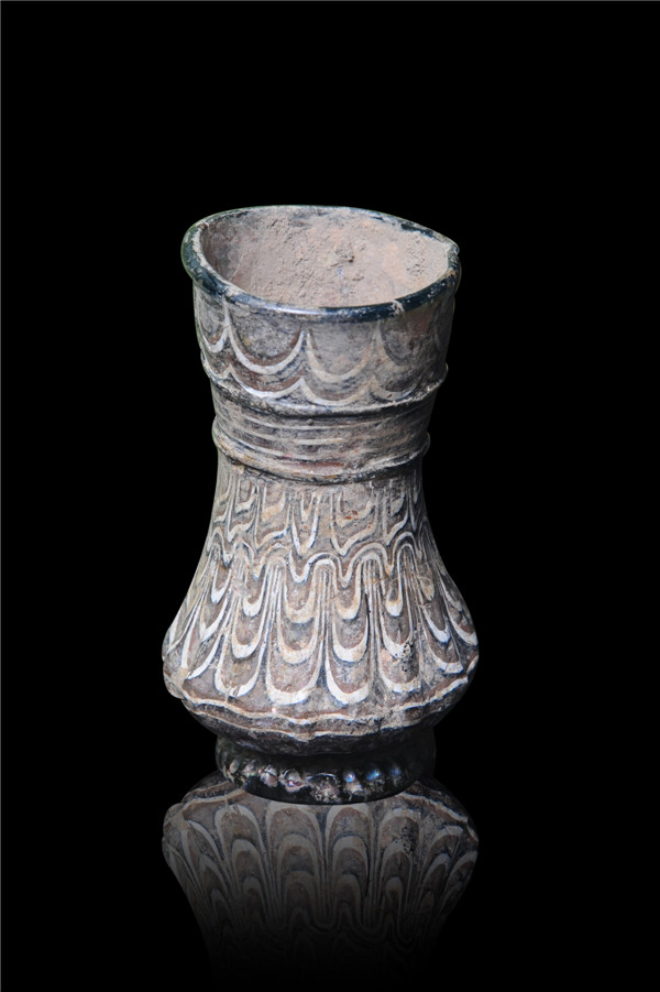 高13厘米,腹径6厘米。高13厘米,腹径6厘米。不透明玻璃质地,口为不规则圆形,束腰,五圈环形纹饰平行环瓶身一周。花瓣形环形纹饰,圈足。阿富汗出土,冯彦涛借展。