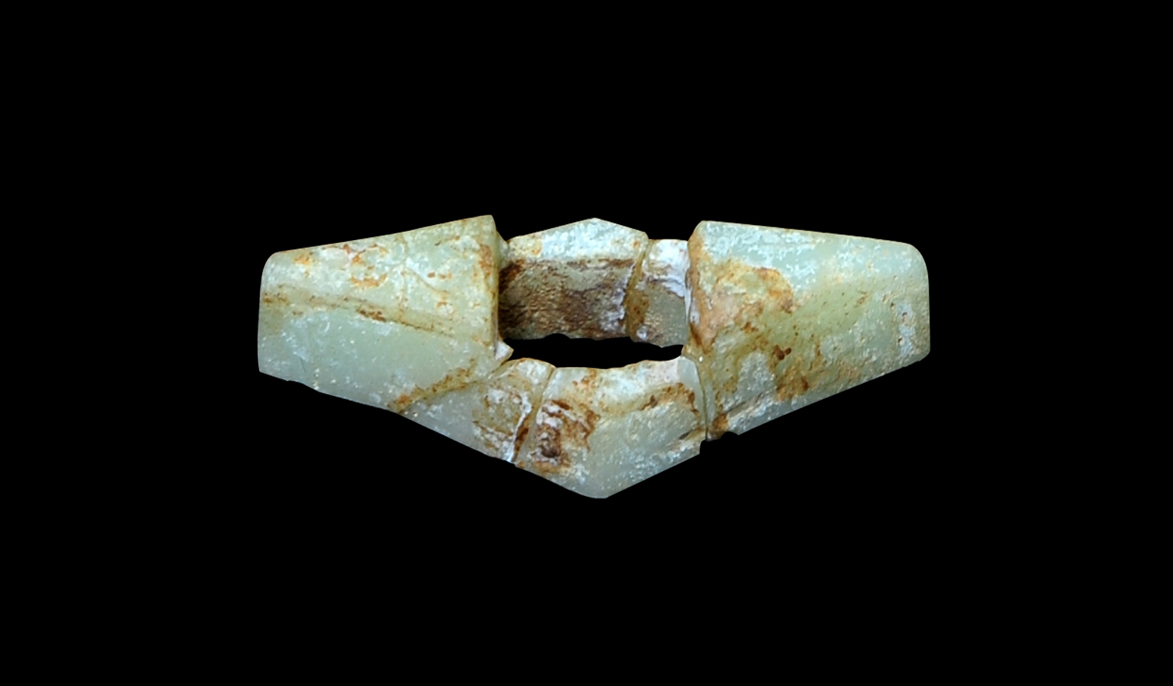 高1.5 厘米,长5.5厘米白色半透明玻璃质,表面喑哑,前后纹饰,受沁较为严重,图案为阴线,模铸法成型,剑格基本造型自战国至两汉均没转变,中部突起一脊梁如鼻梁,一端缺口,一端微尖,嵌入剑柄后,缺口的一端朝剑首,微尖一段向剑刃,剑格俯视程菱形,中间纳剑柄的孔呈长方形。玻璃剑格的出土及传世并不多见,原因有可能是剑身因长期腐蚀风化而膨胀,剑格受压爆破无存。