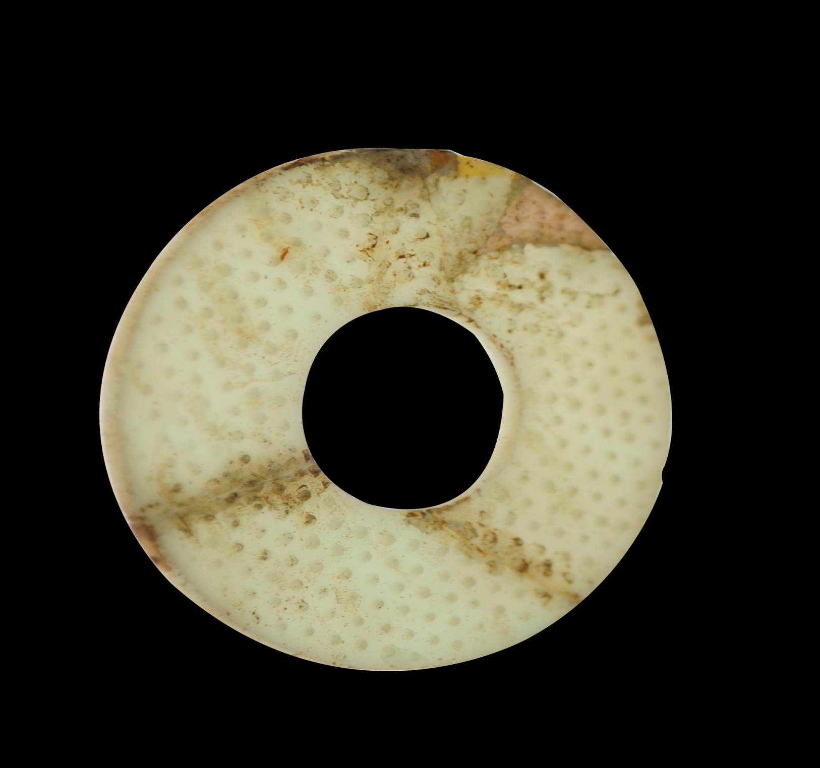 外径9.3厘米、内径3.9厘米、厚0.3厘米,白色半透明,胎质均匀,两面饰乳钉纹,正面润泽光滑,背面哑,边沿粗糙。纹饰为模压成型,玻璃壁内沿及外沿边陲并模压弦纹一周,其中一段乳钉纹凸起不明显,可能是粘稠的玻璃液未能完全注入模具所制。整体纹饰与孔径偏离。本品氧化铅及氧化钡含量很高,属铅钡玻璃。类似的玻璃壁见于战国时期湖南长沙市杨家山18号墓,该璧正面为乳钉纹,背面为方格纹;其中乳钉纹一面部分纹饰扁平,凸起不明显。形制欠均整且粗糙的玻璃壁可能与璧的用途有关,不少玻璃壁边沿粗糙尖利,根本不适合配挂之用,这类璧应为明器,作馆内装饰之用。 |