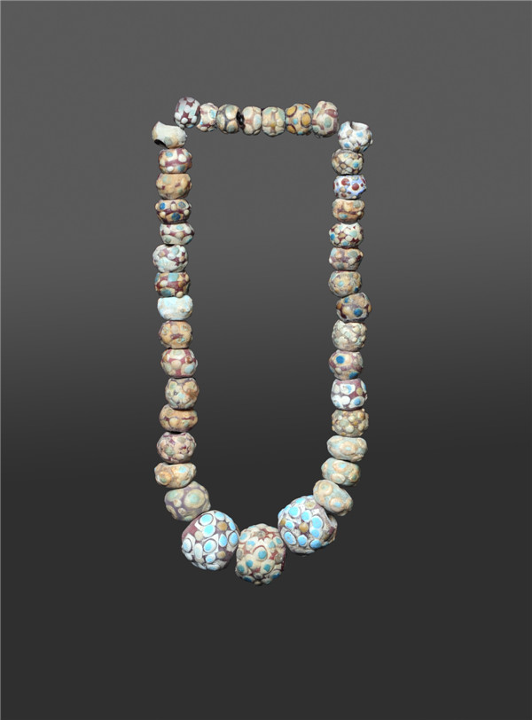 灰陶胎外敷玻璃层。整组珠造型并不均整,大珠直径2.4 厘米,共四十枚,色调统一,可分二式。一式微珠数量多,其大小稍有差异,但基本纹饰一致,即赭色网纹图案将珠体分为错对两列或三列,交汇点为为黄色单层眼,网格地色白色,其上为蜻蜓眼饰。网纹上交汇点之间再置以蜻蜓眼。样品显示氧化铅含量较高,并含氧化钡,属铅钡玻璃。此类玻璃浆堆料陶珠,制作较镶嵌技术简便,可能为玻璃蜻蜓眼珠的一种廉价代用品。