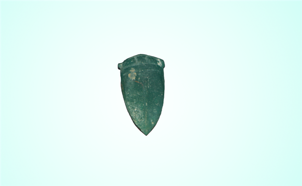 长3.7CM宽2.2CM,半透明玻璃质,有绿色、白色,但因土沁变质而失透,土沁有棕色及灰白色,表面光滑但光泽微弱。三件蝉形制相同,均平底弧背,扁平三角状头,两眼旁出,背部后段起棱以别左右翼,尖尾;另外又在胸背位置略施阴线刻画。样本的氧化铅含量很高,并含2.02%氧化钡。 |