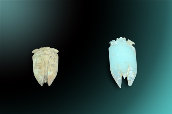 长4.8厘米,宽2.8厘米,高0.8厘米,白色半透明玻璃质地,受沁较为严重,通体呈米黄色,双面刀工,蝉眼部突出,双翅尖锐,刀工柔缓,应为西汉早期工艺。