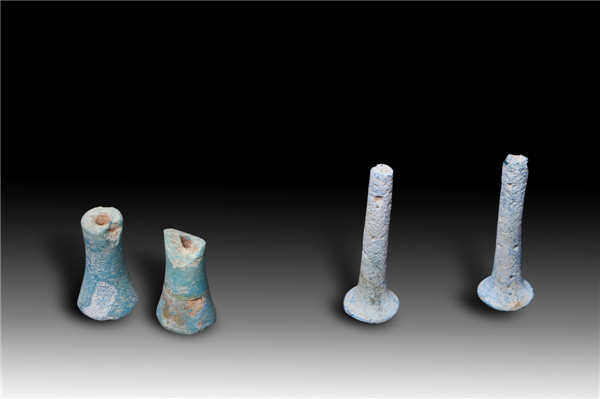 实心笄形器,蓝色半透明玻璃质,风化严重,表面已成风化物,质地脆弱,漆已剥落,无纹饰。样本氧化铅很高,并含少量氧化钡。《释名》:“穿耳施珠曰珰。”《说文解字》:“瑱,以玉充耳也。”