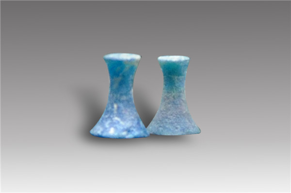 蓝色透明玻璃质,耳珰风化明显,部分表面覆盖着米色风化物,受沁较重,表面光滑无光泽。束腰形状,上窄下阔,流行与两汉。河南禹县白沙西汉早、中期墓中出土同类耳珰。青海西宁市大通县出土类似玻璃耳珰19件,广西昭平M5汉墓出土玻璃耳珰2件,其中铅、钡含量较高,属铅钡玻璃。