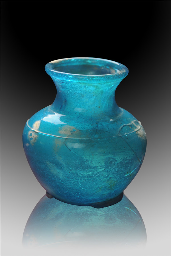 高9厘米,腹径8厘米,口径5.5厘米,蓝色半透明质地,表面微受沁,光滑亮泽,腹残缺1处,圆形圈足部分残缺。国家二级文物。定州博物馆借展。