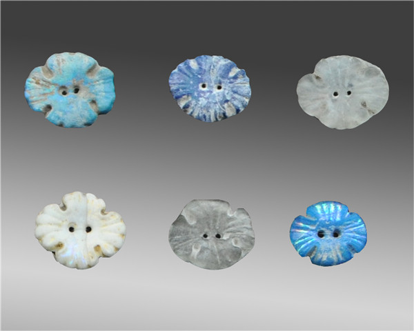 扁薄片形玻璃花瓣形饰共六枚,玻璃色泽深浅不一,有蓝色、白色、绿色,中有一对穿孔,部分玻璃风化成银灰色。玻璃饰是单面模印而成,背面光滑,正面印有凹凸纹饰,作花瓣状;属钾钠钙玻璃。这种花瓣形玻璃饰,原为元代流行的铜发髻的簪头饰物,同类型玻璃花瓣曾出土于吉林扶余岱吉元墓(共八件)及吉林扶余石桥欢迎砖厂元墓(共六件),吉林扶余其他地区出土类似形饰共3件,可见吉林地区所生产及使用的器物。