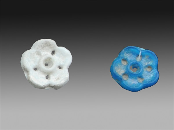 蓝色玻璃梅花形饰,大小不一,是单面模具压印而成,中有一穿孔,部分风化成灰白色表层。这种五瓣形小型玻璃饰用途不明,可见于元代流行的一种耳坠饰(类比云南宜良县孙家山M33元墓出土玻璃珠),亦可能是服饰或是其他坠饰的配件;而本品的成分组成亦跟编号180金耳环上的蓝色玻璃花形饰一致。接近孔雀蓝色玻璃,可见于甘肃漳县元汪世显家族墓出土的七瓣莲花杯托。