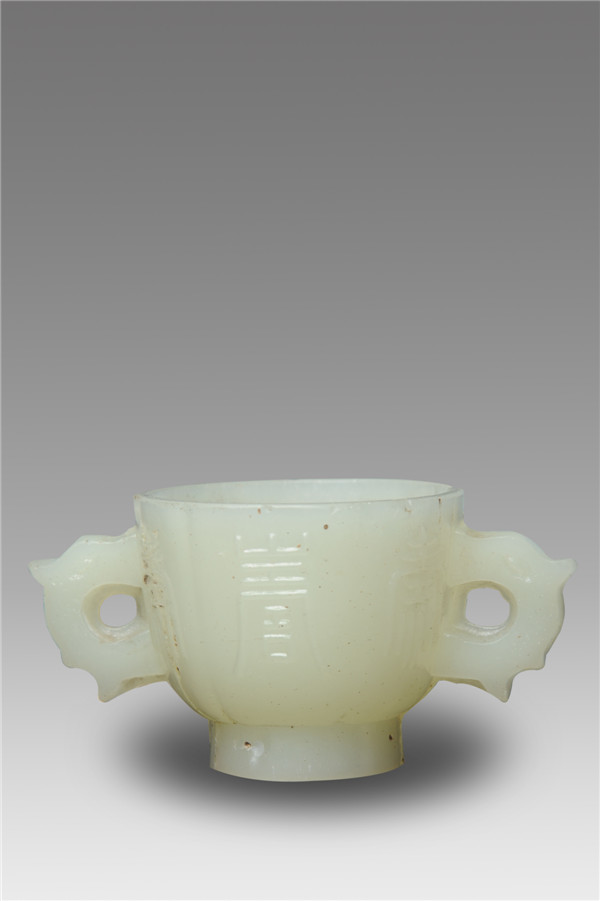 高5 厘米、口径6.2 厘米、足径3.7 厘米,浅绿色玻璃质,胎色均匀半透明,表面光滑润泽,圆口,平唇,外方内圆,圈足,两侧为扁平龙纹把耳,背后有隆起的角、足、龙身只阴刻有龙眼,模制成型,双耳位置与杯身可见模线,成分中含有较高的铅,不含钡、钾、盖等元素。 双龙耳杯是明清流行的酒杯式样,白玉制成较为常见,本品是仿玉制成,制作规整,表面有汉字纹饰,属明末清初文人用品。
