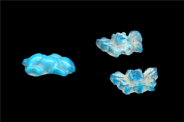 长度2.1厘米、宽度1.4厘米、厚度0.3厘米,蓝色不透明玻璃质地,模压成形,单面纹饰,中部一穿孔,米黄色沁。用于耳饰、簪头花饰等。
