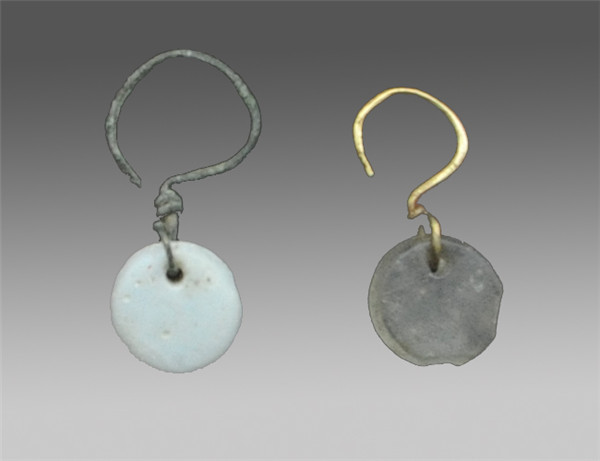 高4.1厘米、直径1.7厘米、厚度0.8厘米,无色透明或乳白色玻璃质地,模压成形后,经打磨制成,素面无纹,形如十五之满月,上端有一穿孔,悬挂于铜环上,玻璃侵蚀较重。