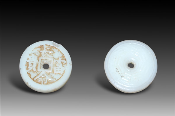 直径4.1 CM,圆形,圆孔,白色半透明玻璃质地,有八卦纹饰,为镇宅辟邪的风水用具。