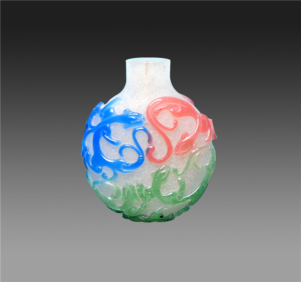 高6厘米,白色玻璃胎,扁圆体,上红、蓝、绿有三色蟠螭纹。河北省文保中心借展。