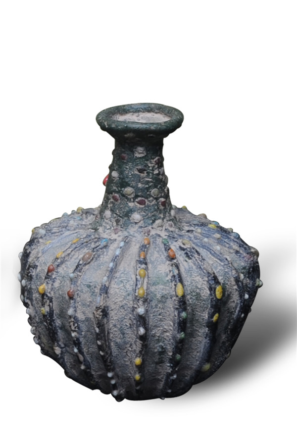 腹径9厘米,高12厘米,绿色半透明玻璃质地,喇叭口,细颈,瓶身为瓜形,阔腹下敛,有竖向条形纹路,表面镶嵌各色玻璃质颗粒。出土于阿富汗,冯燕涛先生借展。