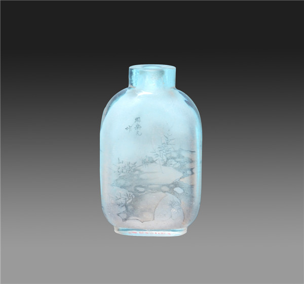 高6厘米,透明玻璃质地,椭圆形圈足,内有周乐园内画。周乐园,北京人,晚清光绪年间内画鼻烟壶的一代宗师,作品题材很广泛、山水人物,花鸟鱼虫、书法等,无不精美,尤其擅长描绘江南山水。河北省文保中心借展。