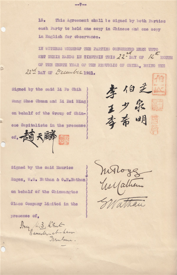 1921年12月22日李伯芝等发起人与秦皇岛玻璃公司代表华洋合股合同。