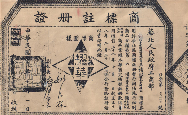 耀华“双套金刚钻”牌商标于华北人民政府工商部注册证。